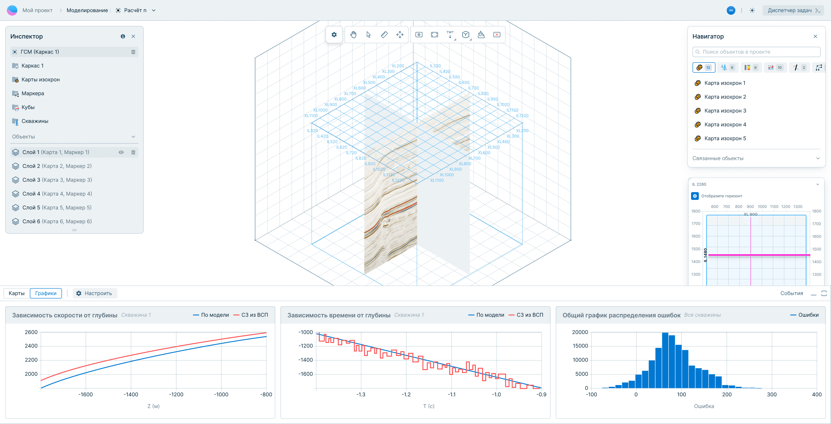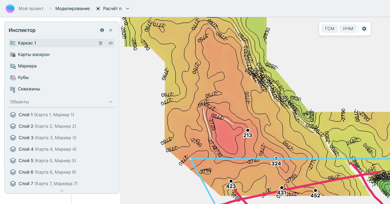 Единый модуль: входные данные вынесены прямо на рабочую область. Выбор модели и запуск расчета (ГСМ или НЧМ) реализованы через компактный виджет Dynamic Island. Что позволяет пользователю мгновенно переключать режимы моделирования, не теряя фокус на данных