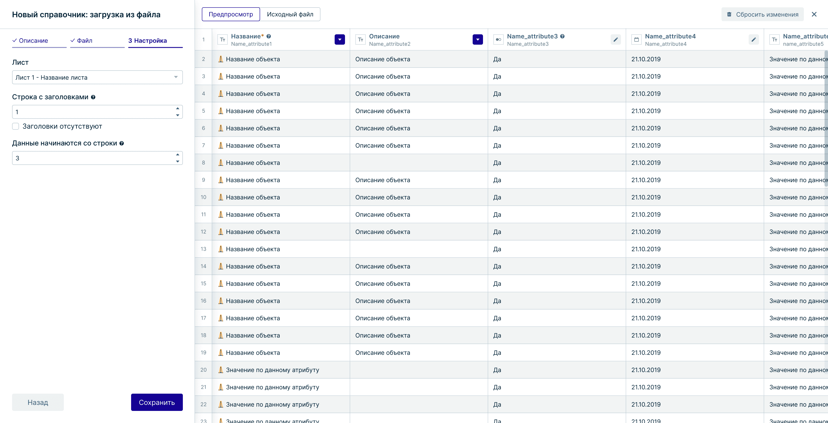 Импорт объектов в НСИ: пользователь сопоставляет атрибуты загружаемого файла с атрибутами справочника, а результат сразу видит в режиме предпросмотра