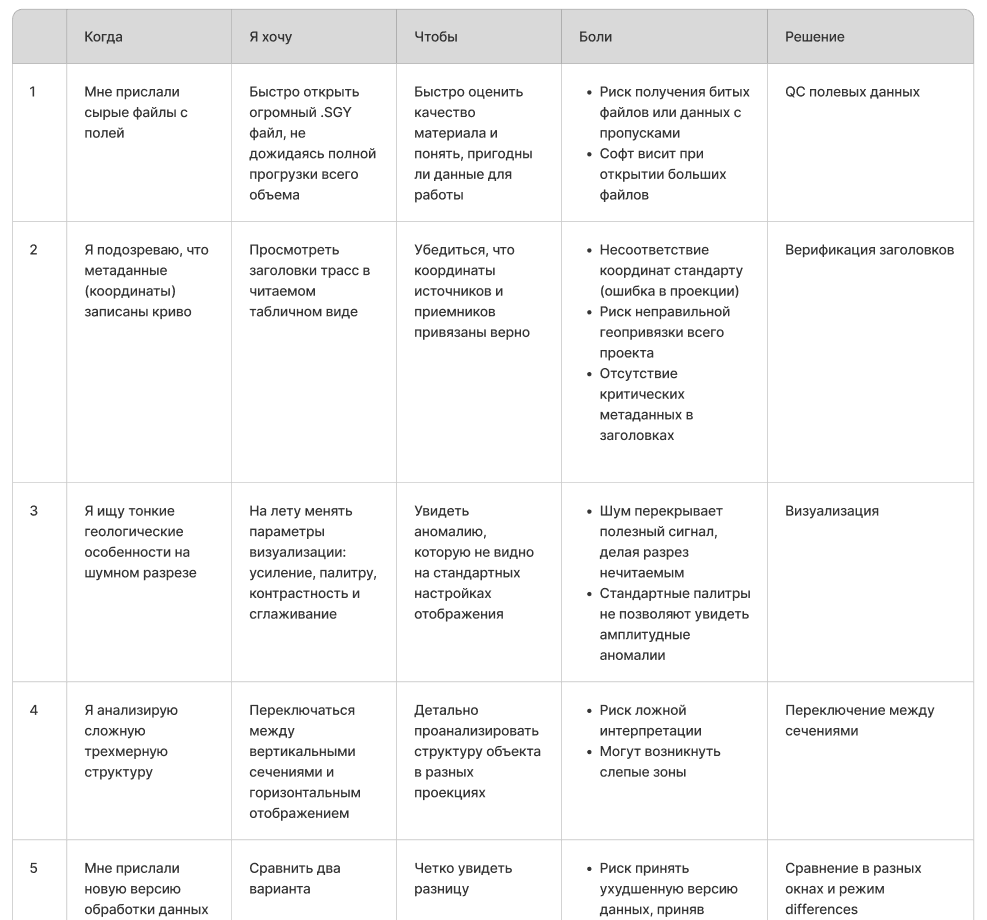 Декомпозировала запросы экспертов в конкретные сценарии работы. Базовые потребности сводятся к быстрой загрузке файлов формата сегвай, верификации материалов и детальному просмотру заголовков без зависания интерфейса